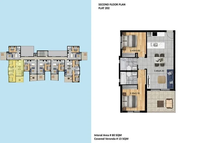 Two-bedroom apartment 202, with an internal area of 80 m², is located on the second floor of a three-storey building.