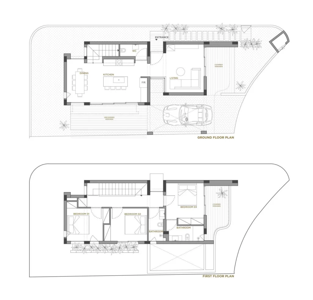 The program of the residence is distributed on two levels: A ground floor accommodates the living spaces and an upper one houses bedrooms. More specifically, the functions of the ground floor are in a linear arrangement with the kitchen and dining room being open plan and in direct connection with the living room. Meanwhile, the parking area of the residence is in direct contact with the kitchen.
