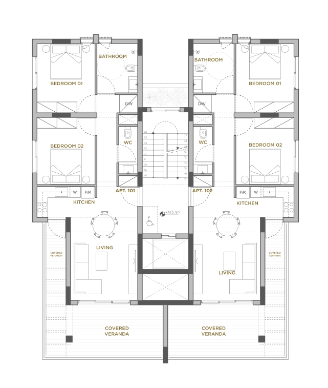 The apartment offers a bright open-plan living and dining area, two spacious bedrooms, one main bathroom, and a guest WC. Designed to maximize natural light and ventilation, the residence benefits from large openings on both sides of the building, enhancing the living experience with a sense of openness and unobstructed southern views.
