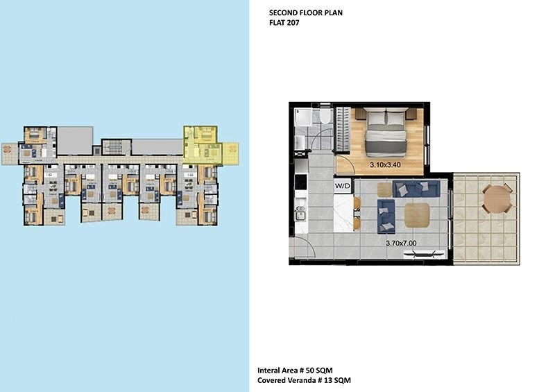 One-bedroom apartment 207, with an internal area of 50 m², is located on the second floor of a three-storey building.