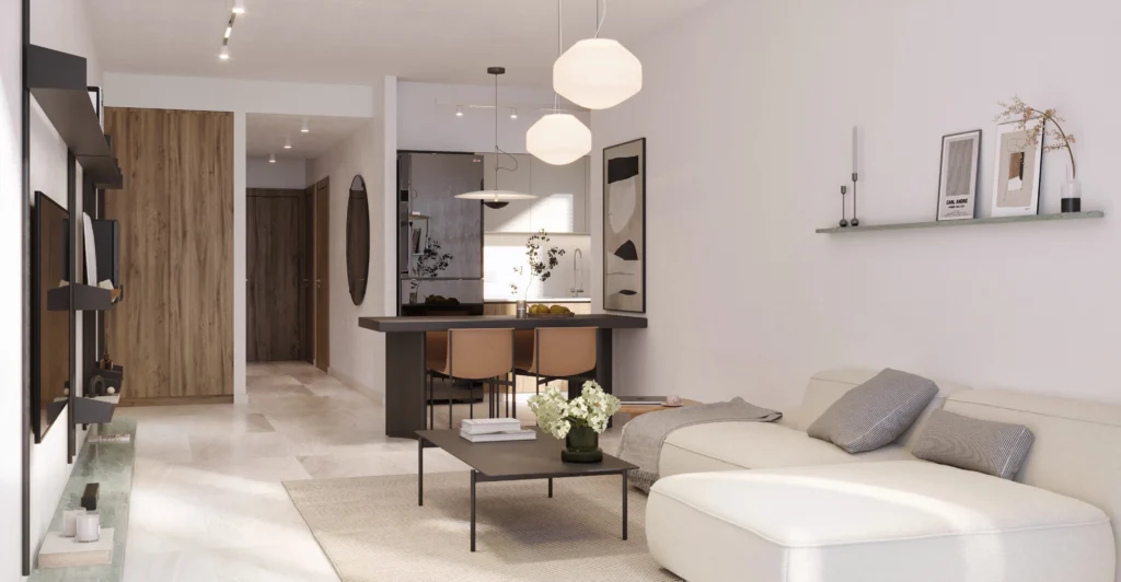 The apartment offers a bright open-plan living and dining area, two spacious bedrooms, one main bathroom, and a guest WC. Designed to maximize natural light and ventilation, the residence benefits from large openings on both sides of the building, enhancing the living experience with a sense of openness and unobstructed southern views.