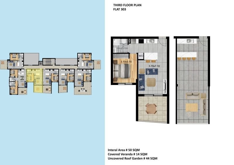 One-bedroom penthouse 303, with an internal area of 50 m² and a 44 m² roof garden, is located on the sixth floor of a three-storey building.