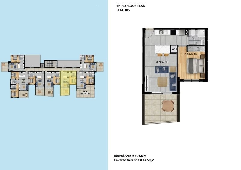 One-bedroom apartment 305, with an internal area of 50 m², is located on the third floor of a three-storey building.