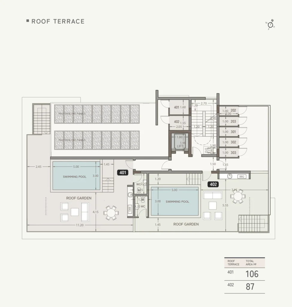 The penthouse features expansive living spaces with three-meter ceilings, water-based underfloor heating, and a cutting-edge VRV air-conditioning system for maximum comfort and energy efficiency. The open-plan layout flows seamlessly onto spacious covered verandas, while the private rooftop terrace boasts a swimming pool and panoramic views of the sea, city, and coastline.