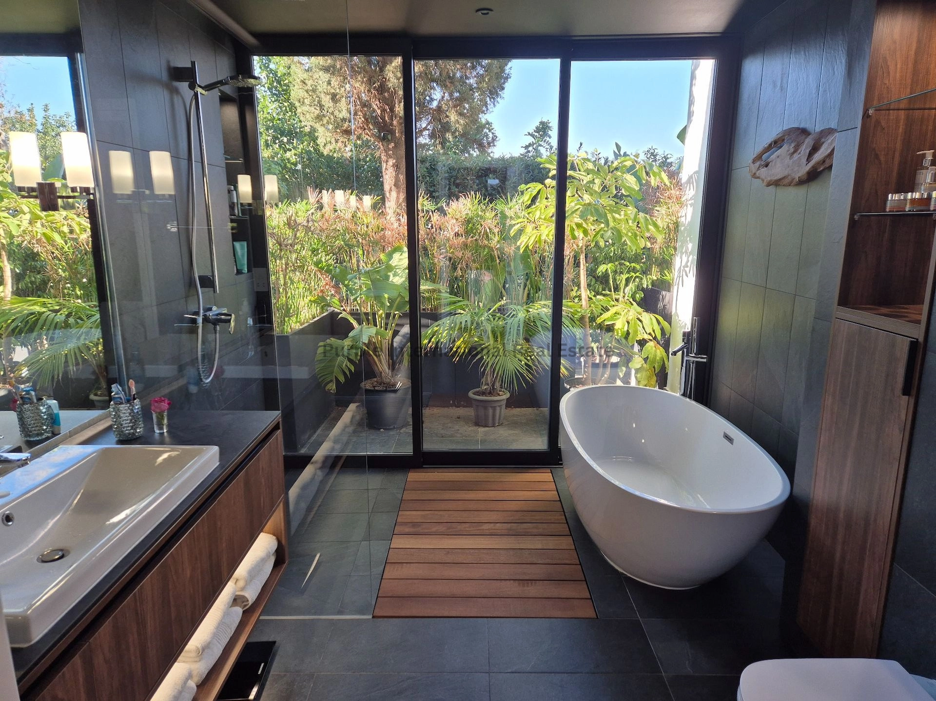 The spacious master bedroom with its ensuite bathroom and a walk-in wardrobe has large sliding doors leading towards pool and garden.