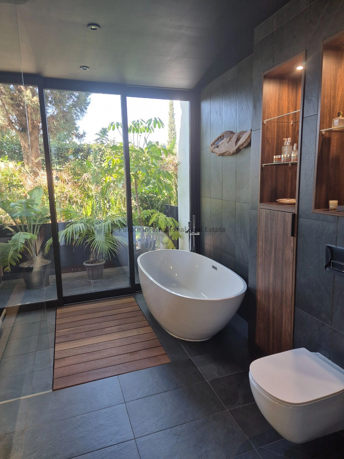 Situated on a gently sloping 1427sqm plot this unique property features a large front-yard with a private drive-way, automatic gates and 2 parking places. The south-facing section of the villa has large floor-to-ceiling windows and sliding doors that lead to the 10x5m private pool, a shaded lounge area and a 200sqm terrace with views of the Mediterranean Sea sparkling in the distance.