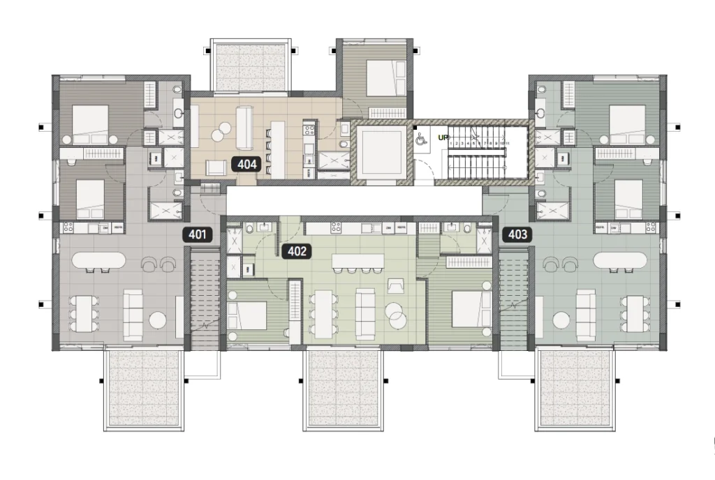 The apartment features a spacious open-plan layout with 4-meter high ceilings, large windows, and seamless integration of indoor and outdoor living. Equipped with underfloor water-based heating and a built-in VRV air-conditioning system, it ensures an ideal climate year-round.