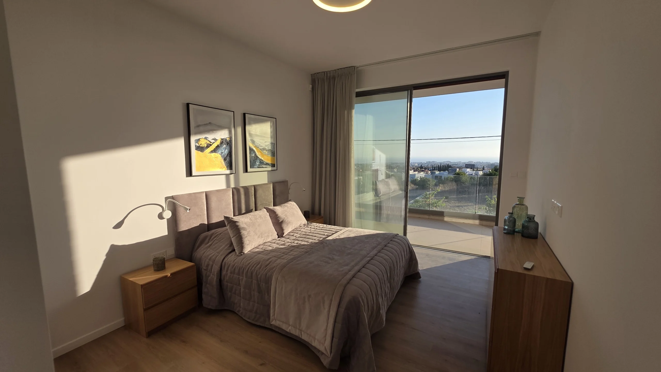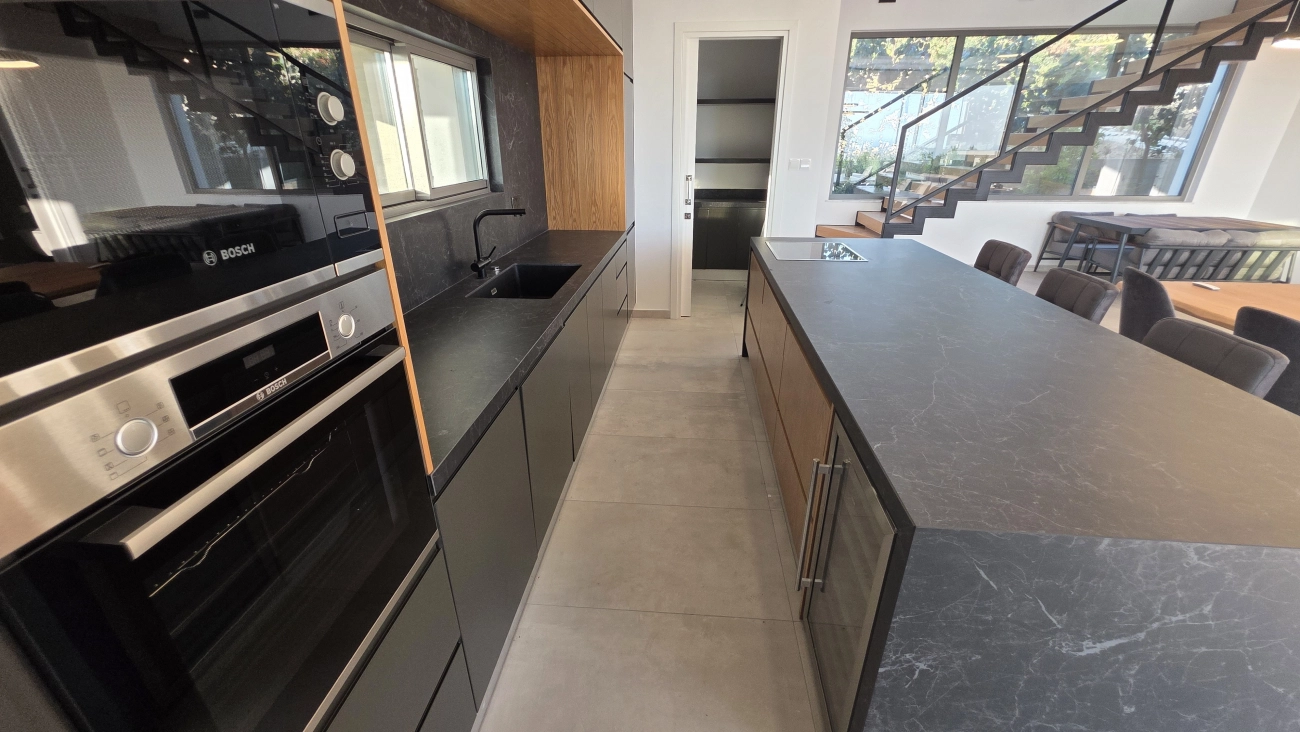 New three bedroom villa for sale in Konia, Paphos. The total area is 200 m2, the plot is 660 m2. Fully furnished, built in 2024, energy class — A. The villa is equipped with air conditioning in all rooms, has three bathrooms, a private pool, a garden, an alarm system, a balcony, a storage room and a covered parking space.