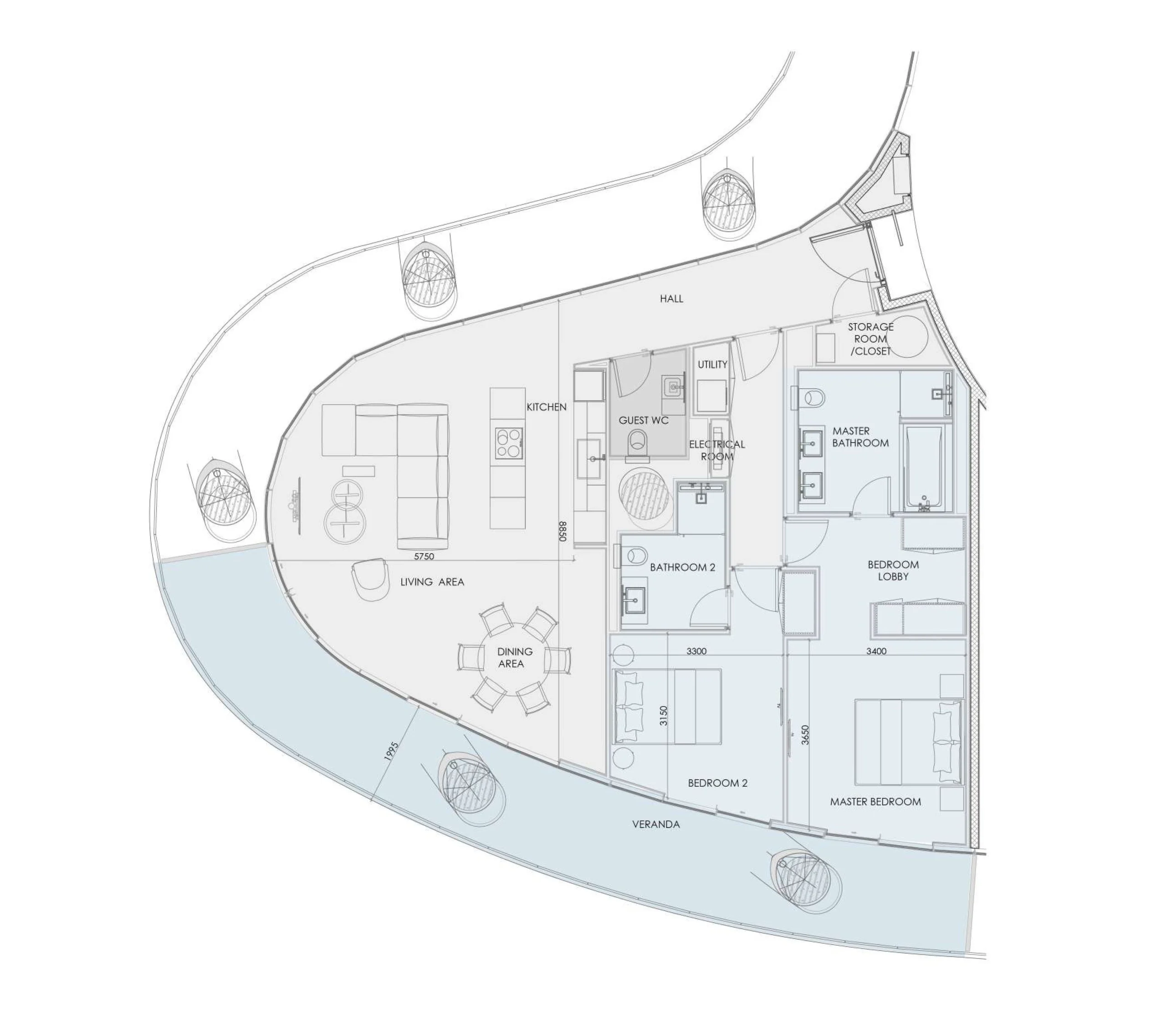 This stylish two-bedroom apartment is located in a landmark residential tower at the heart of a vibrant marina development. Designed for luxurious coastal living, the apartment features open-plan interiors, full-height glass doors, and a spacious covered veranda that seamlessly blends indoor and outdoor spaces.