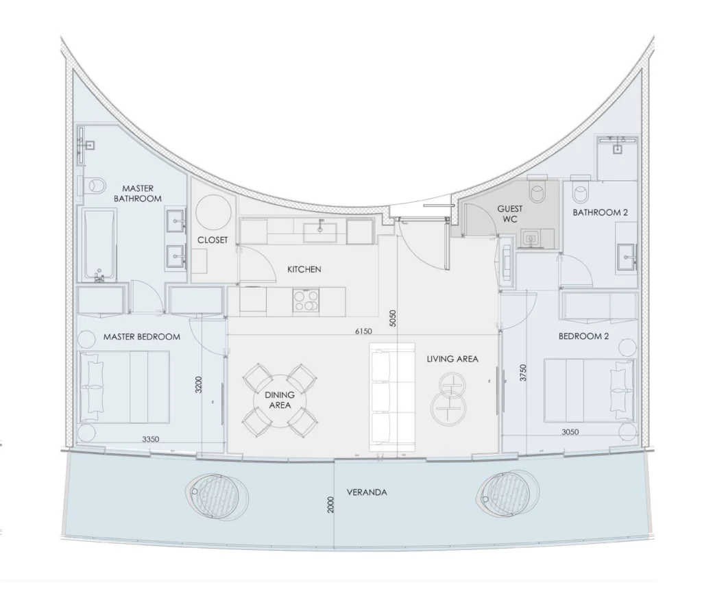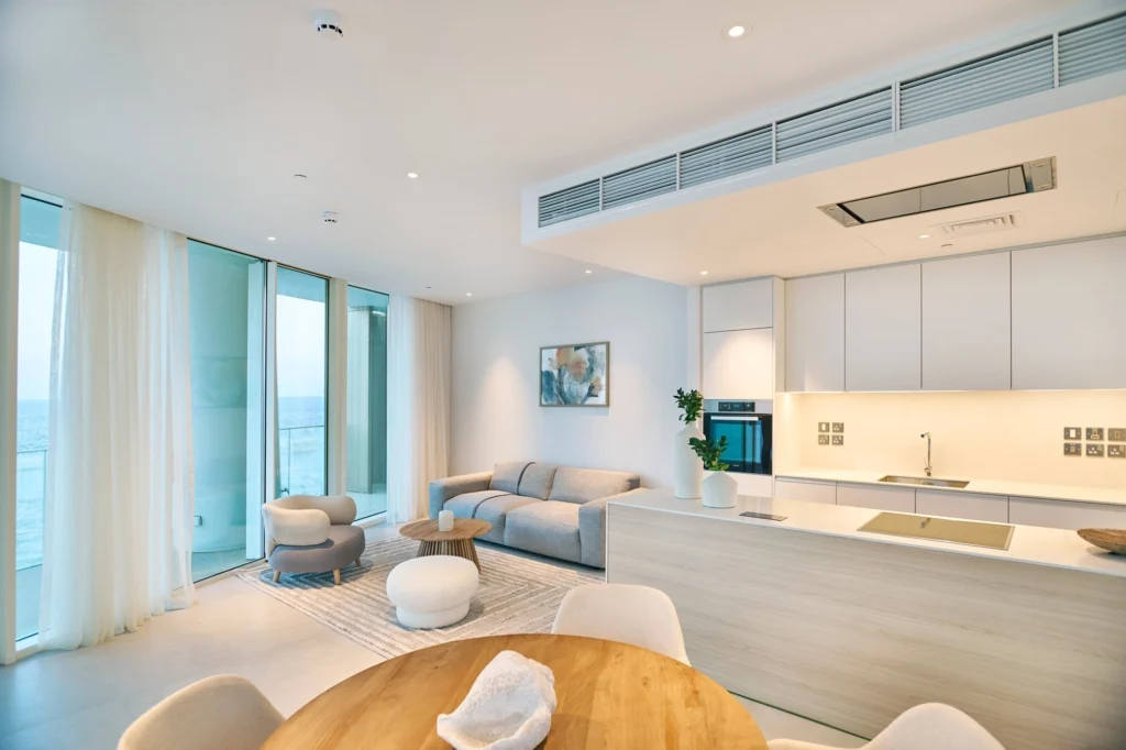 This stylish two-bedroom apartment is located in a landmark residential tower at the heart of a vibrant marina development. Designed for luxurious coastal living, the apartment features open-plan interiors, full-height glass doors, and a spacious covered veranda that seamlessly blends indoor and outdoor spaces.