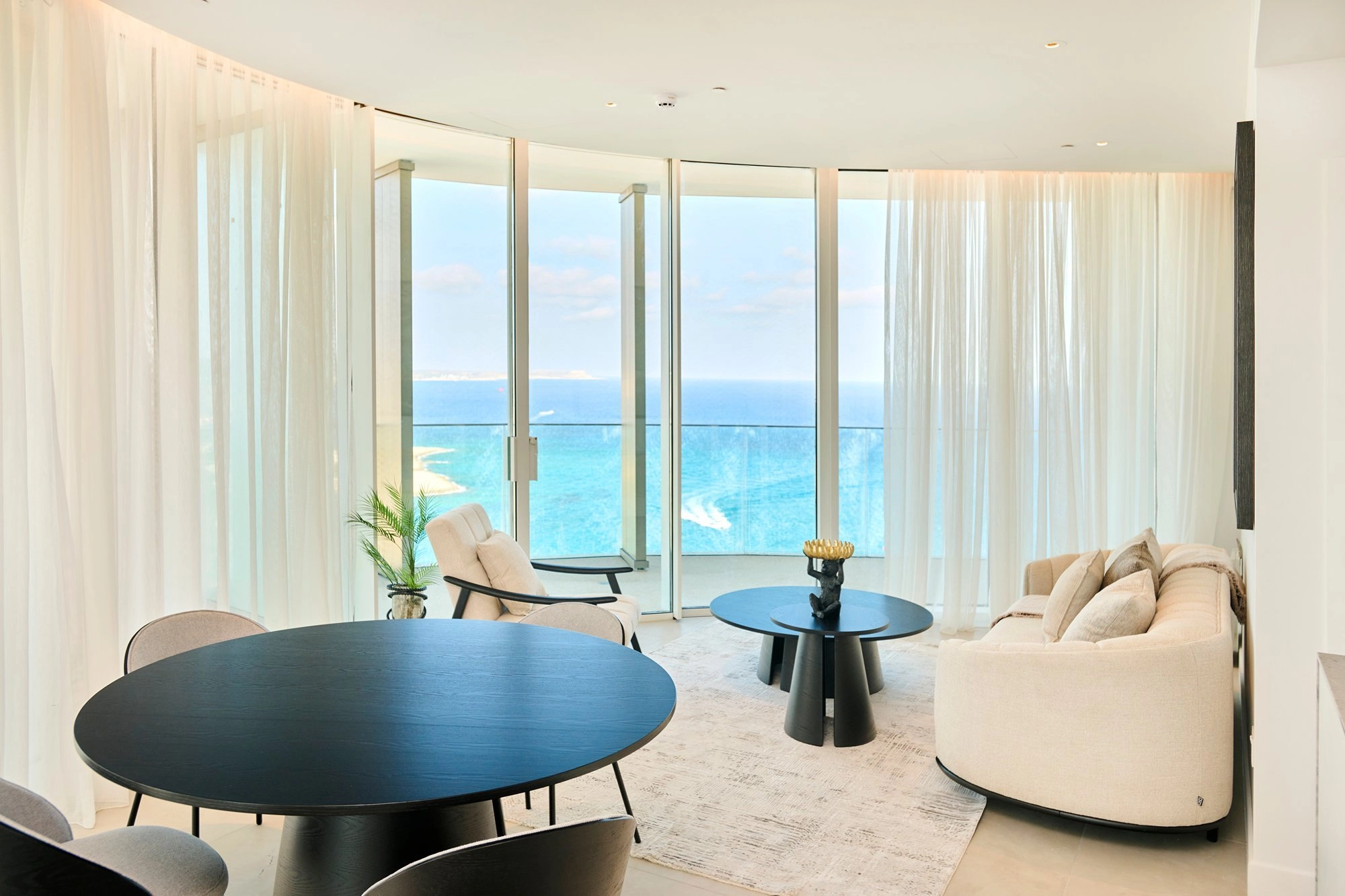This stylish three-bedroom apartment is located in a landmark residential tower at the heart of a vibrant marina development. Designed for luxurious coastal living, the apartment features open-plan interiors, full-height glass doors, and a spacious covered veranda that seamlessly blends indoor and outdoor spaces.