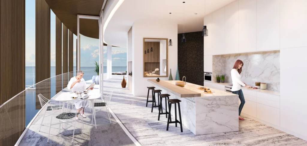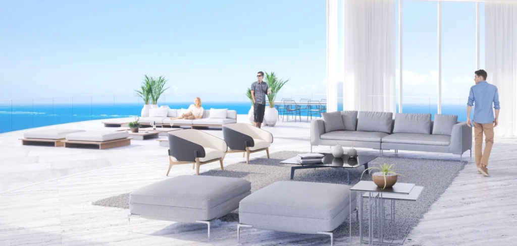 – Access to a private amenity deck with infinity-edge pool, cabanas, and bar