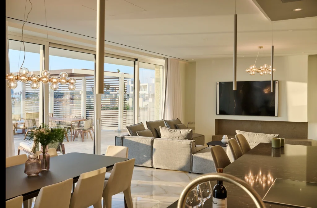 Located on the western edge of a prestigious seaside development, this luxurious 4-bedroom villa offers the ultimate in Mediterranean living. Just steps from a crescent-shaped beach, the property combines refined sophistication with contemporary comfort in a secure, resort-style setting.
