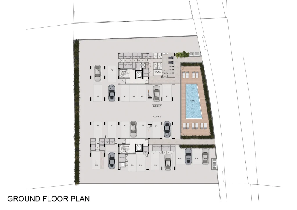 This modern residential complex is ideally located in the quiet and upcoming area of Livadia, Larnaca, just 300 meters from the sea. The development consists of two blocks (A & B), with 11 apartments in each block.