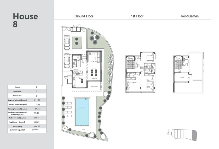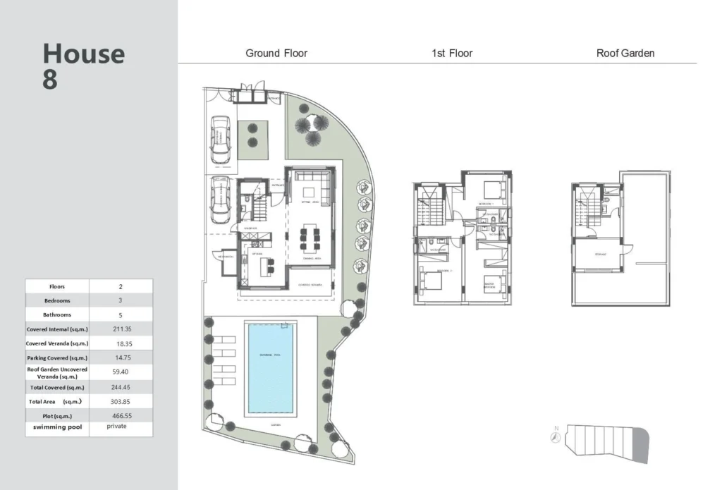 A two-storey villa with three bedrooms with a private swimming pool, offering an internal area of 211.35 m², is situated on a 466.55 m² plot.