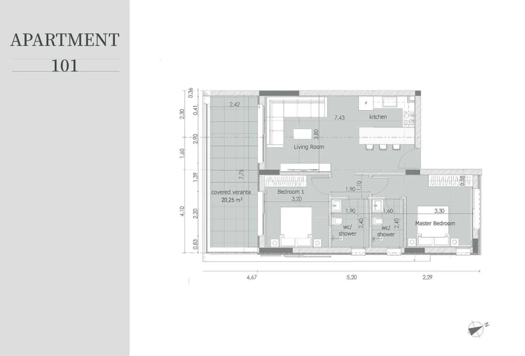 Two-bedroom apartment 101, with a living area of 75 m², is located on the first floor of a three-storey building.