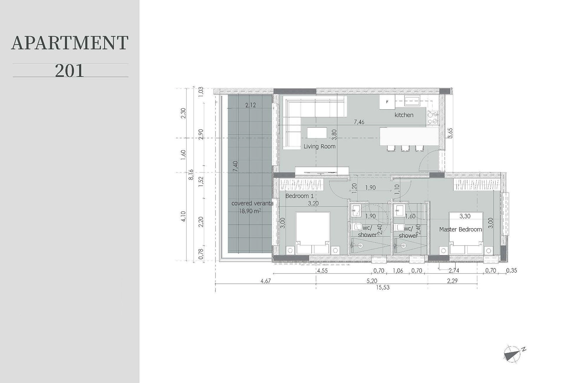 Two-bedroom apartment 201, with a living area of 75 m², is located on the second floor of a three-storey building.