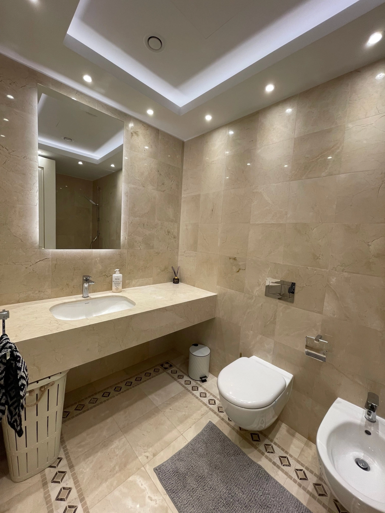 Bathroom Details: Luxury marble and granite, bidets, and hygienic douche