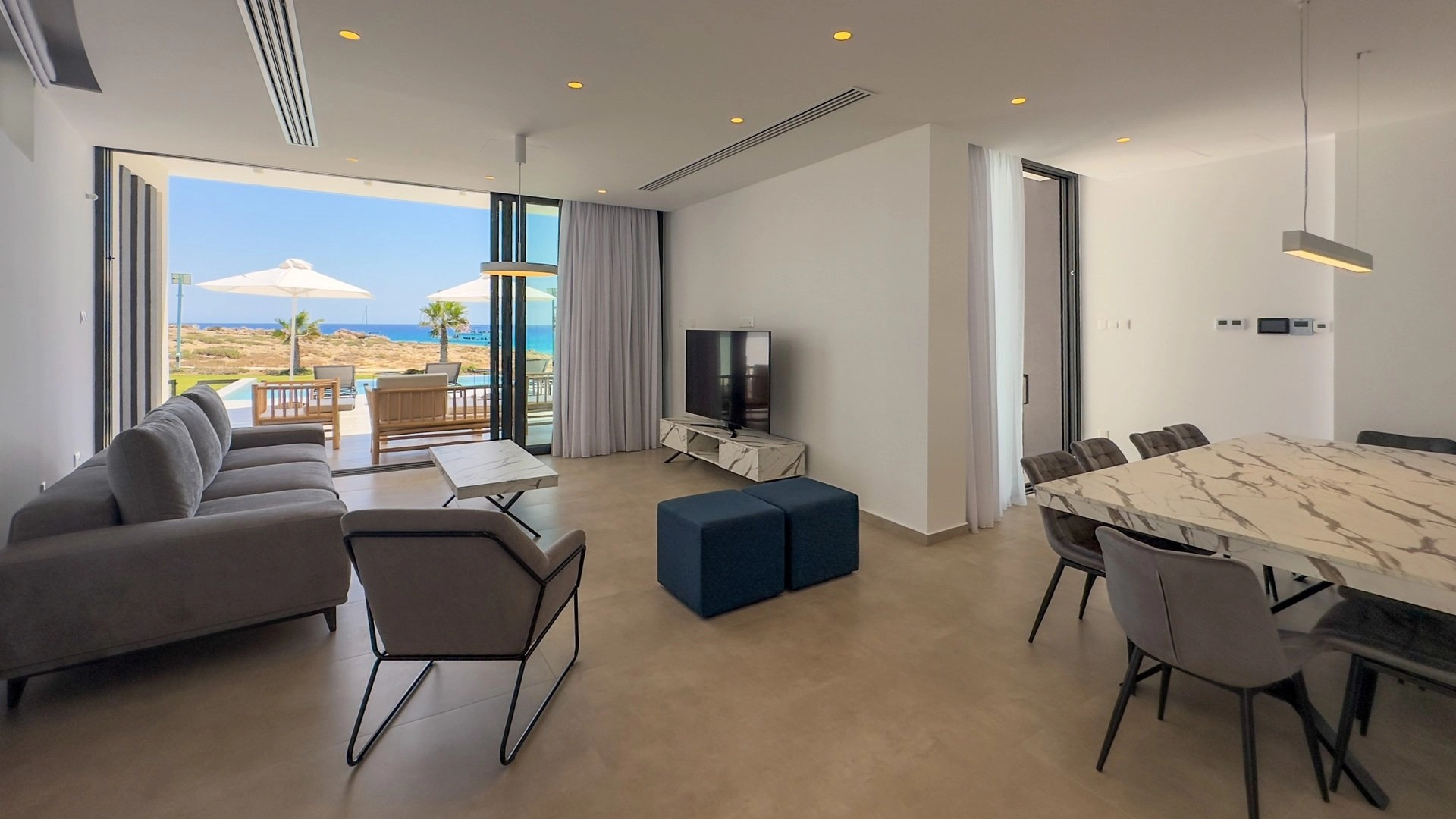 Located on the shores of Ayia Napa, this contemporary 4-bedroom villa offers luxurious coastal living with panoramic sea views.
