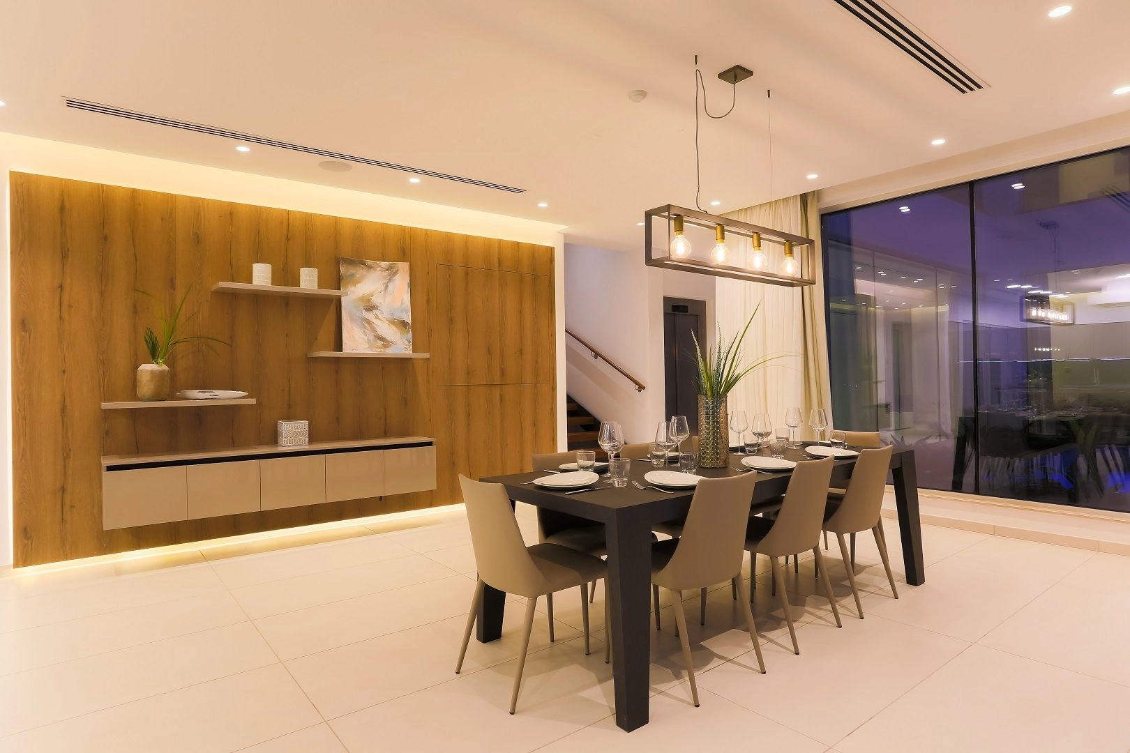 All three floors of the interior’s layout blend comfort and refinement, and the living area offers spacious rooms with French windows that let plenty of natural light into the villa’s every room.