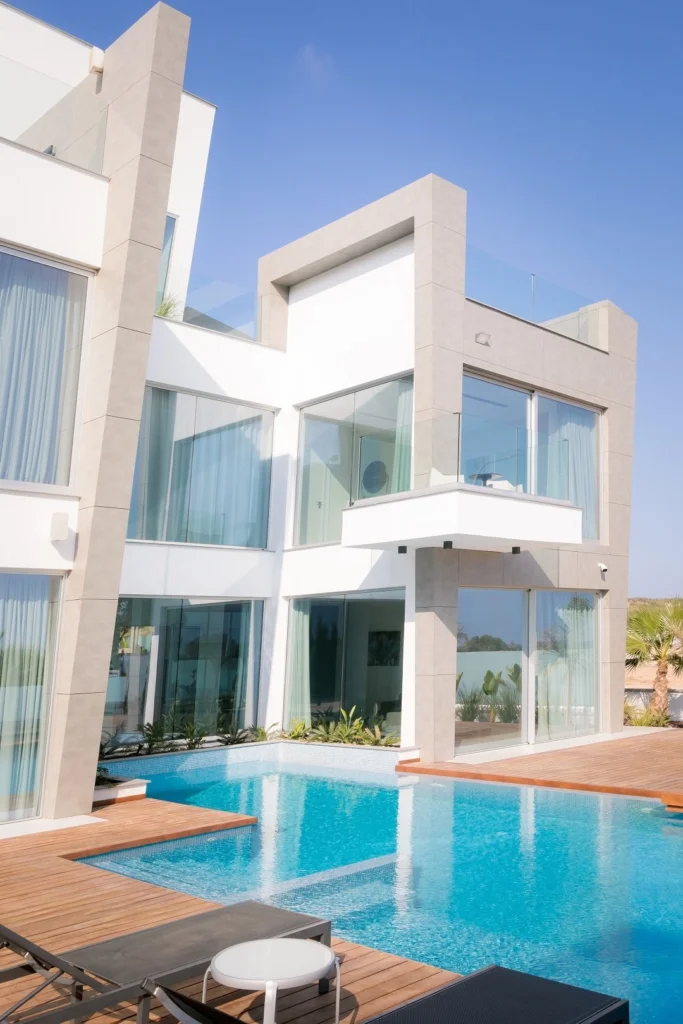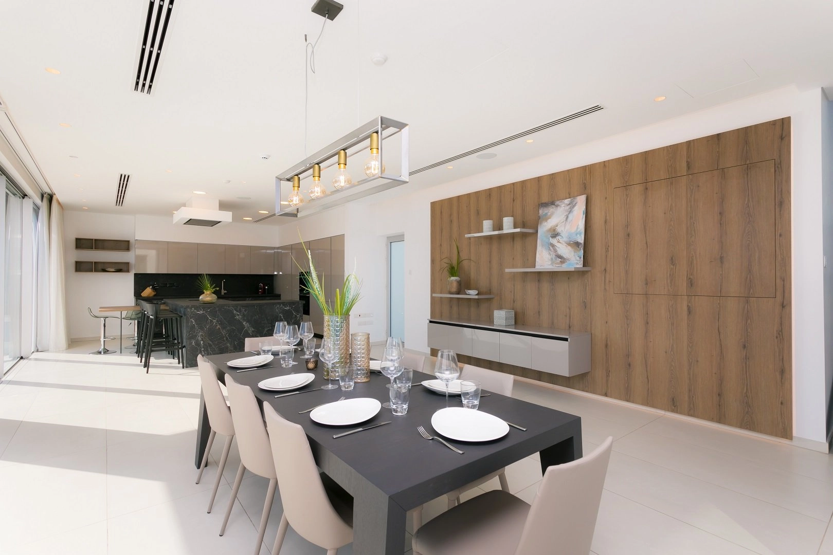The property is located in a residential development where modern design blends with the ocean’s timeless beauty. One of the six stunning homes that make up the development, each at their own vast unique plots, the villa is one of the six eye-catching villas that overlooks the turquoise waves at Cape Greco, around 150 meters from the sea. Modern architecture combines aesthetic lines with practicality and makes use of premium finishing materials. The ultimate result is a luxury island design that is modern, bright, and crisp and is suitable for 21st-century luxury living.
