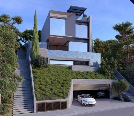 This villa is the perfect example of how architectural simplicity can be combined with complex engineering — integrating the building into the mountain landscape with a bespoke design. The key architectural concept is the breathtaking sea view from every room in the villa, along with an infinity cascade swimming pool.