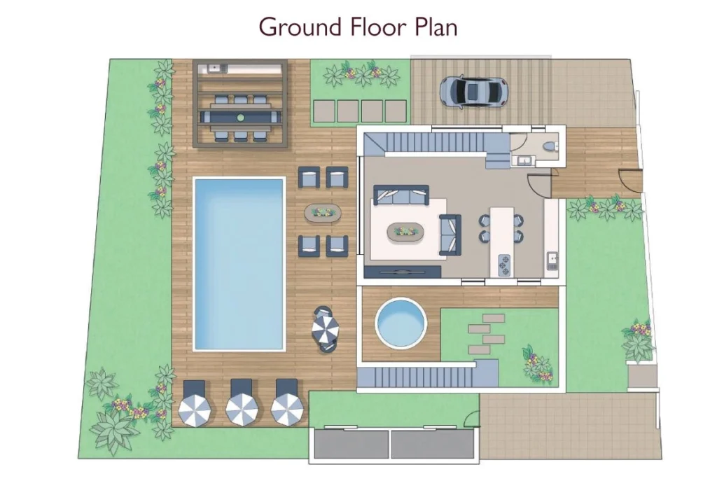 Additionally to the living areas and kitchen in the ground floor, the bedrooms in the first floor, the lower level is reserved for recreational space, a fourth bedroom and jacuzzi. Enjoy amazing evenings under the stars at you own roof garden, or in your private garden by the pool sided to the barbecue area.
