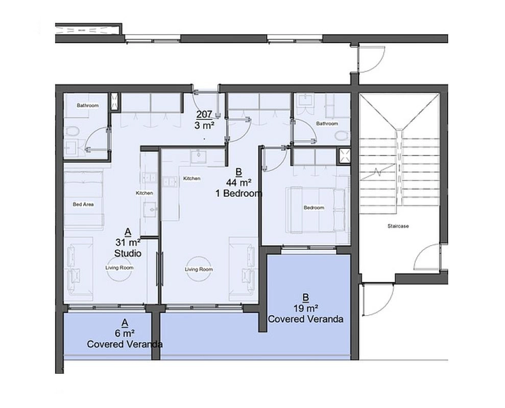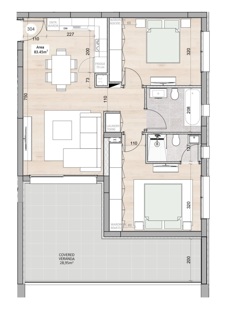 Two-bedroom apartment 207, with a living area of 79 m², is located on the second floor of a six-storey building
