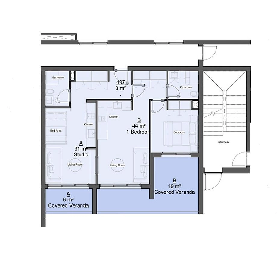 Two-bedroom apartment 407, with a living area of 79 m², is located on the fourth floor of a six-storey building