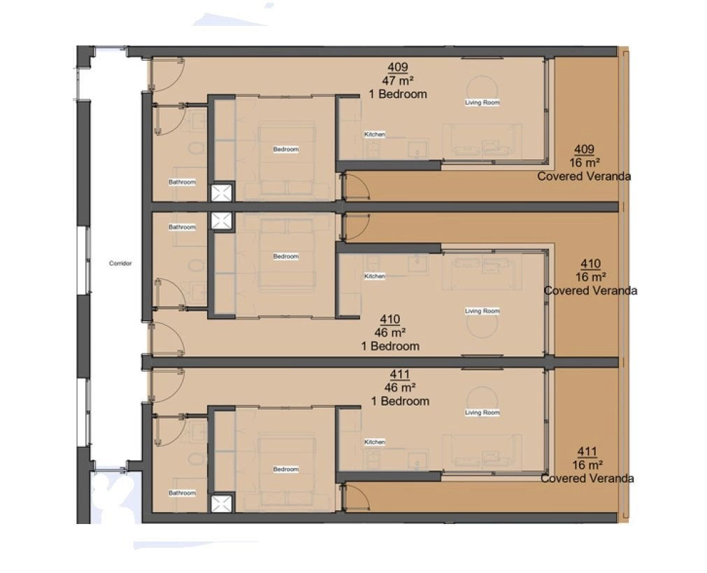 One-bedroom apartment 410, with a living area of 47 m², is located on the fourth floor of a six-storey building