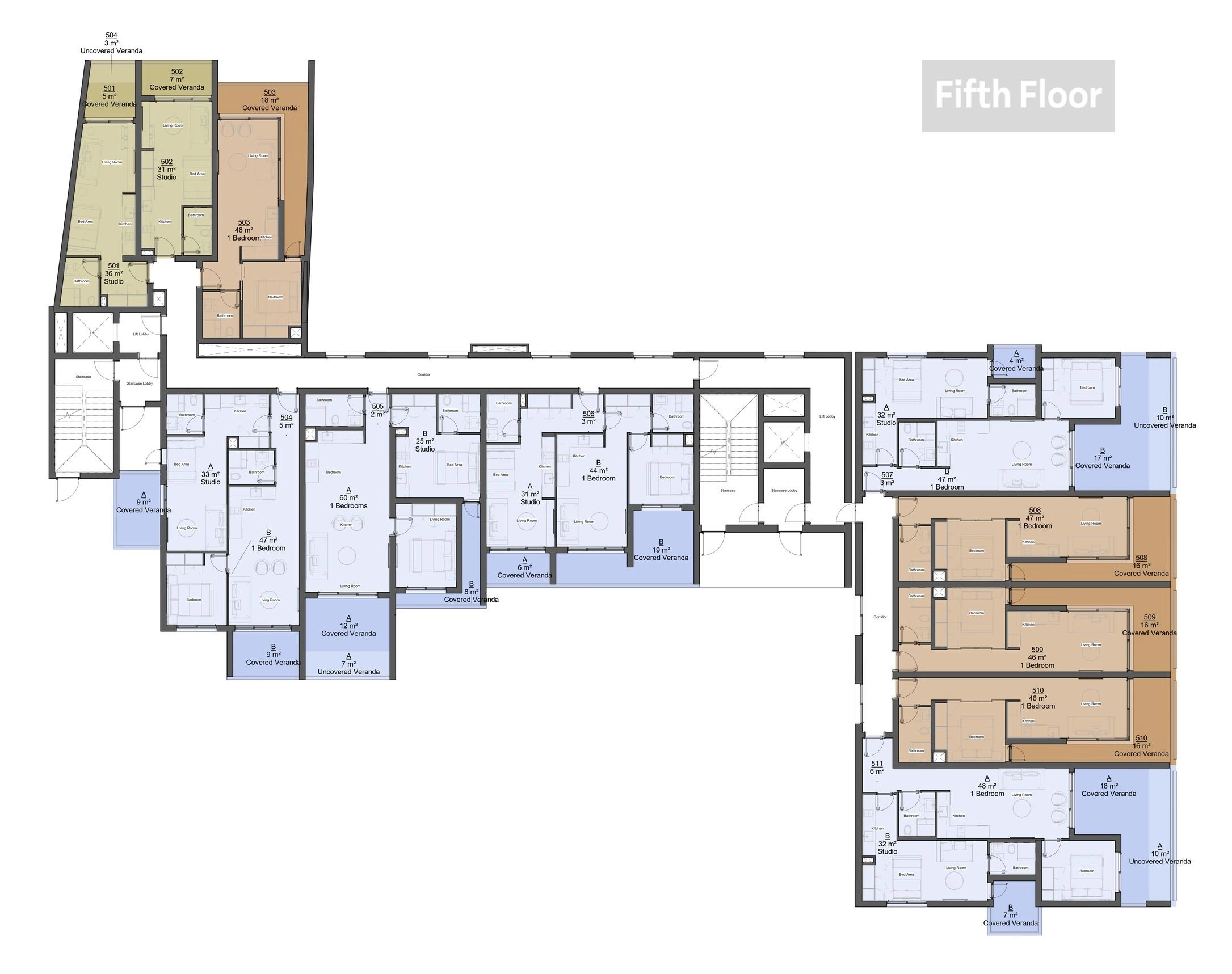 Two-bedroom apartment 506, with a living area of 79 m², is located on the fifth floor of a six-storey building.