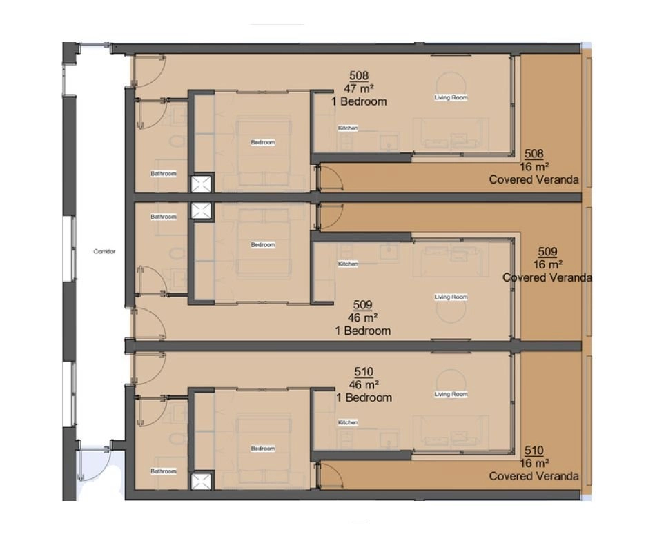 One-bedroom apartment 508, with a living area of 47 m², is located on the fifth floor of a six-storey building.