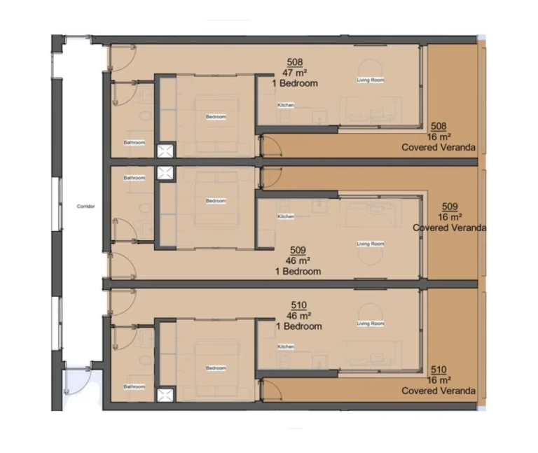 One-bedroom apartment 510, with a living area of 47 m², is located on the fifth floor of a six-storey building.
