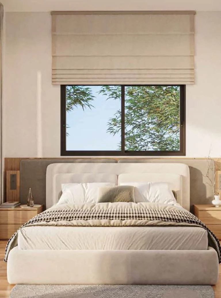 The villa features an open-plan layout with expansive floor-to-ceiling windows that fill the interiors with natural light and provide seamless access to the garden and patio areas. All three bedrooms are generously sized, including a master suite with en-suite bathroom and private balcony. A guest WC and family bathroom complete the layout.