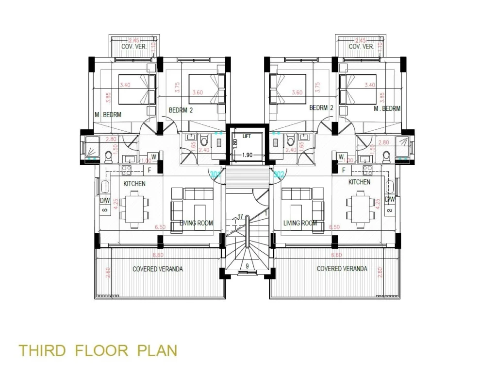 Two-bedroom apartment 302, with a living area of 78 m², is located on the third floor of a four-storey building.