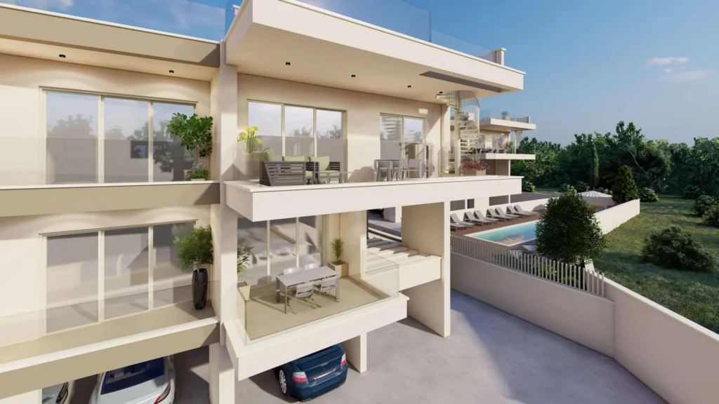 Penthouse for sale in the area of Pegeia, Paphos. The complex consists of two blocks located on a total area of 2,400 m2. Each block has 8 comfortable apartments with panoramic windows facing south-east to south-west. The elegant facades of the buildings blend harmoniously with the vibrant modern architecture and coastal landscape, creating a harmonious architectural ensemble.The complex offers the following options: double apartments with spacious verandas and two bathrooms; double apartments with sea views, spacious verandas, roof garden and two bathrooms, three-bedroom apartments with sea views, spacious verandas, roof garden and three bathrooms. There are two parking spaces for each apartment. The apartments are decorated using only high-quality materials such as wood, aluminum and marble combined with premium designer furniture and plumbing, eco-friendly solutions and advanced technologies.The complex has an excellent location. The cultural center of the village of Peyia Paphos), convenient access to the main avenue, within walking distance of schools, shops, pharmacies, restaurants and cafes, a professional fitness club, clean municipal beaches, and 20 km to Paphos International Airport.The construction stage is the beginning of September 2025. Planning and construction permits have already been obtained. At the start of sales, there is an opportunity to purchase real estate for personal use or invest in real estate with a potential return of up to 15%.