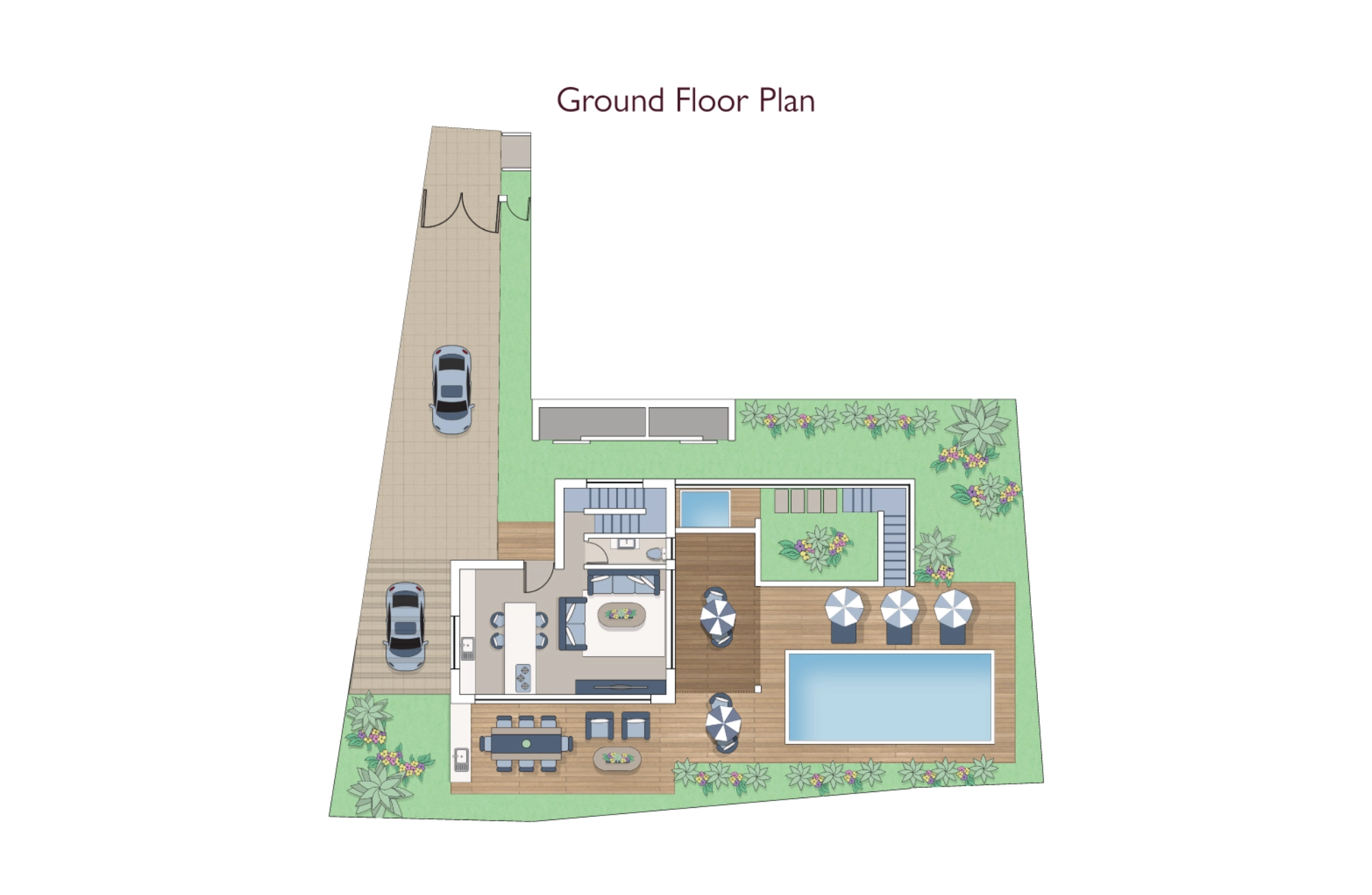 The ground floor presents spacious open-plan living areas, including a stylish kitchen equipped with modern appliances and elegant cabinetry. These spaces flow effortlessly onto the outdoor terrace, where the pool and barbecue area invite alfresco dining and relaxation under the sun.