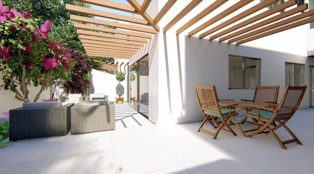 New 3 bedroom house in Agia Fyla area in Limassol. This house is part of a project consisting of 4 separate houses and located in a clean residential, quiet area, just a 15-minute drive from the lively center of Limassol. The land area is 184 m2, living area is 147m2, covered parking is 13 m2, open verandas are 66 m2, covered verandas are 19 m2. Energy efficiency – A. Home alarm system. Photovoltaic panels of 5KW. Electric blinds. An intercom with a camera.
