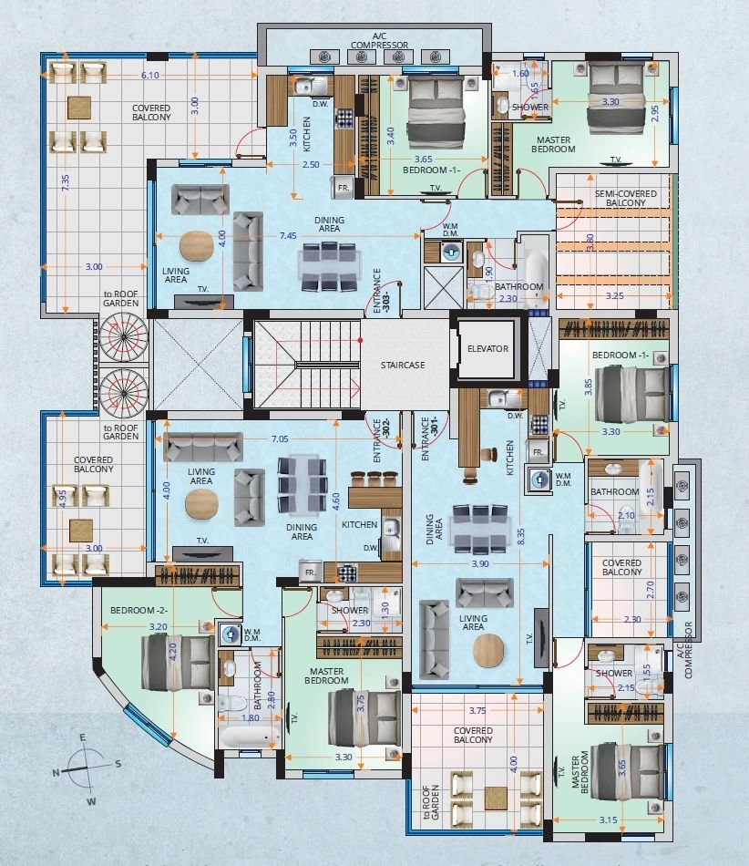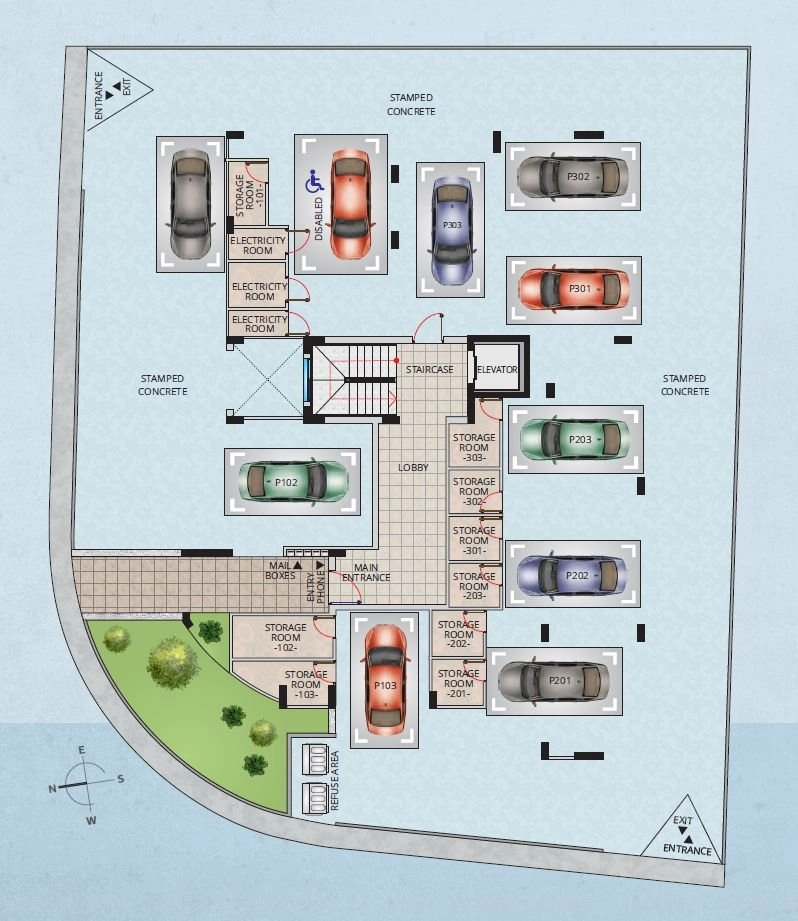 This residential project is located on Anthimou Gazi street. The modern design of the apartment building emphasizes detail and ensures the privacy of the residents. It is a three-story building with comfortable and modern apartments. The first and second floors consist of two two-bedroom apartments and one three-bedroom apartment. The third floor has three two-bedroom apartments, with an additional separate Roof Garden for each apartment. There is covered parking and a storage area for each apartment.