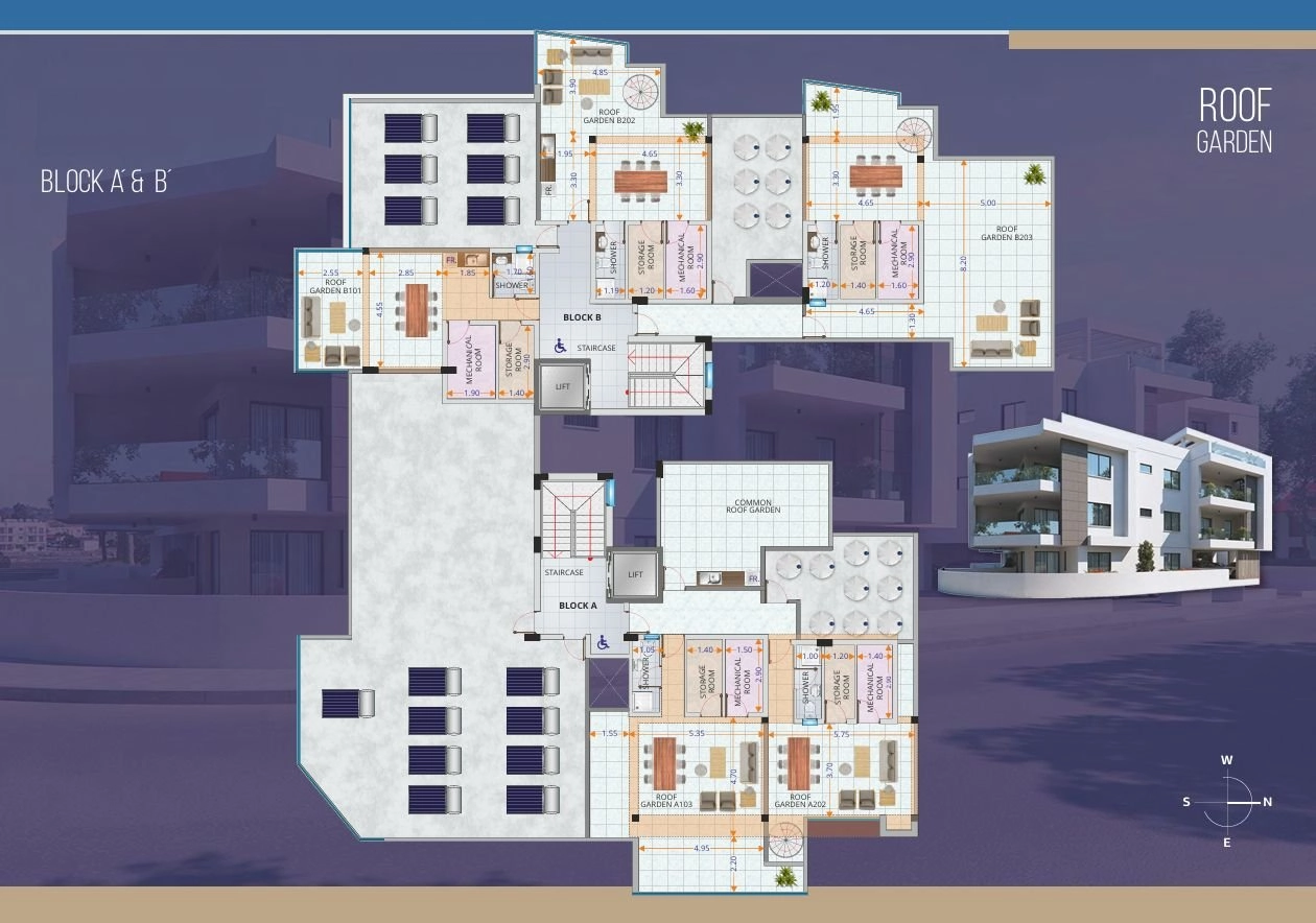 Two-bedroom penthouse 202, with a living area of 76 m² and a 53 m² roof garden, is located on the second floor of a two-storey building in Block B.