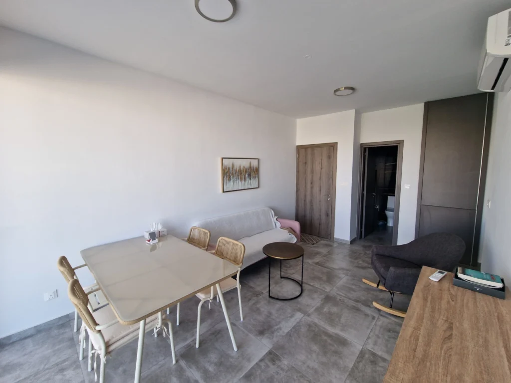 For sale 1(+1) bedroom apartment in a new complex in the area of Sotiros, Larnaca. The complex was built in 2024. A living room with an open-plan kitchen and dining area with access to a covered veranda, a cozy bedroom with a shower, a guest toilet, and an additional room that can be equipped as an office. The apartments are fully furnished and equipped with necessary household appliances. There is also a covered parking space and a storage room. The convenient location of the complex allows you to reach all amenities as quickly as possible. The Sklavenitis supermarket is within walking distance, and the Finikoudes embankment is 7 minutes away by public transport. VAT is not charged.