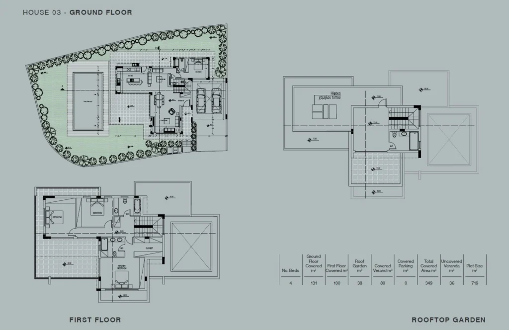 A four-bedroom, three-storey villa with a private swimming pool, offering an internal area of 231 m², is situated on a 719 m² plot.