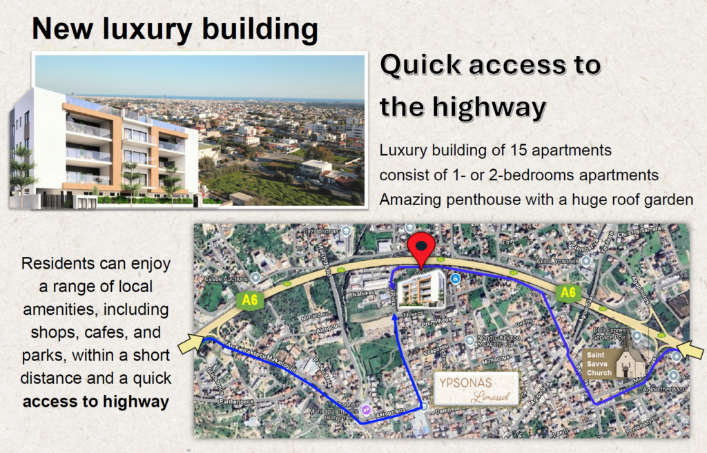 Luxury 2 bedrooms Apartment with 115 sqm including covered veranda + storage + covered parking. Available on 2nd and 3rd floor. Excellent location in a quite area with direct access to highway.  The vibrant area of Ypsonas, offering an ideal blend of comfort and convenience. Residents can enjoy a range of local amenities, including shops, cafes, and parks, within a short distance and a quick access to highway…