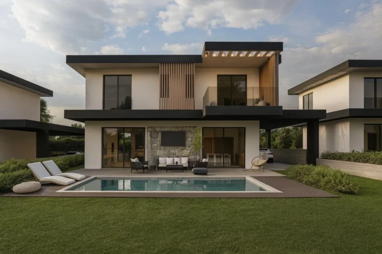 Interior finishes feature Belgian Quick-Step waterproof parquet (lifetime warranty), a full suite of BOSCH appliances, DAIKIN air conditioning, and Sonoff smart home automation. The façade can be customized with HPL panels, natural stone, or wood cladding, allowing for a tailored architectural identity.