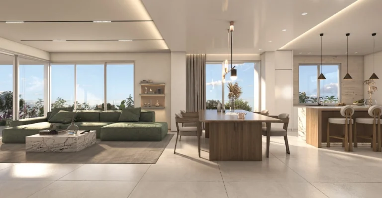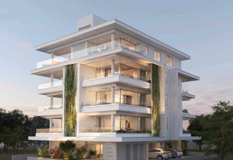 Apartment for sale in Strovolos area, Nicosia. It consists of an open plan kitchen, living room with dining area, two bedrooms, one of them en suite (shower), main bathroom, covered veranda and covered garden. In addition, the property has access to a storage room and covered parking on the ground floor.