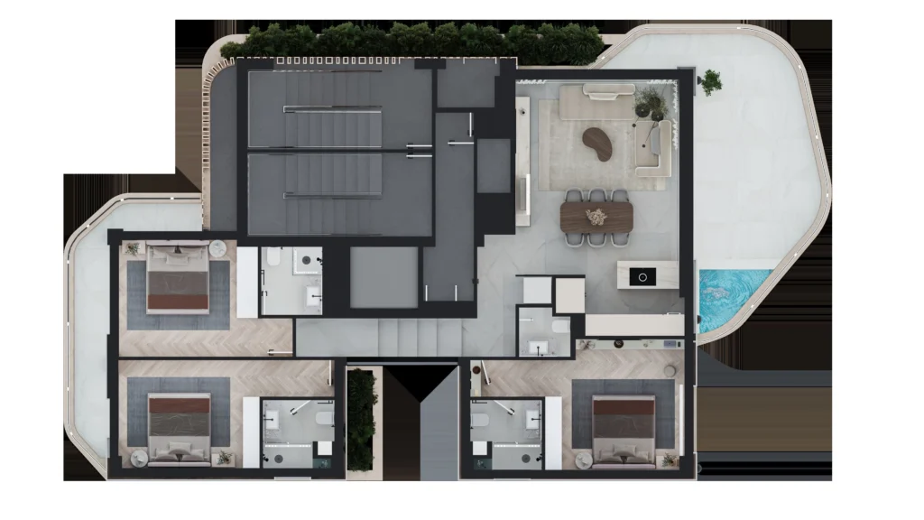 Each apartment has an open-plan layout, 3 bedrooms, 3 ensuites, and a guest bathroom. The building features private parking spaces, concierge services, and a fully equipped gym. Go for a dip in your private jacuzzi on your terrace and enjoy an impeccable sea view!
