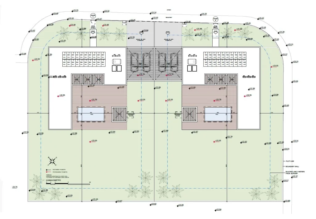Ideally situated in a serene residential neighborhood surrounded by houses and villas, these homes are just 700 meters from the sea. The architecture is both striking and minimalistic, promising to be a standout feature in the area.