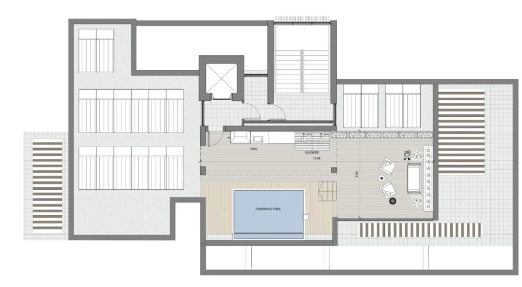 Open-plan kitchen with integrated appliances, marble island, and custom cabinetry
