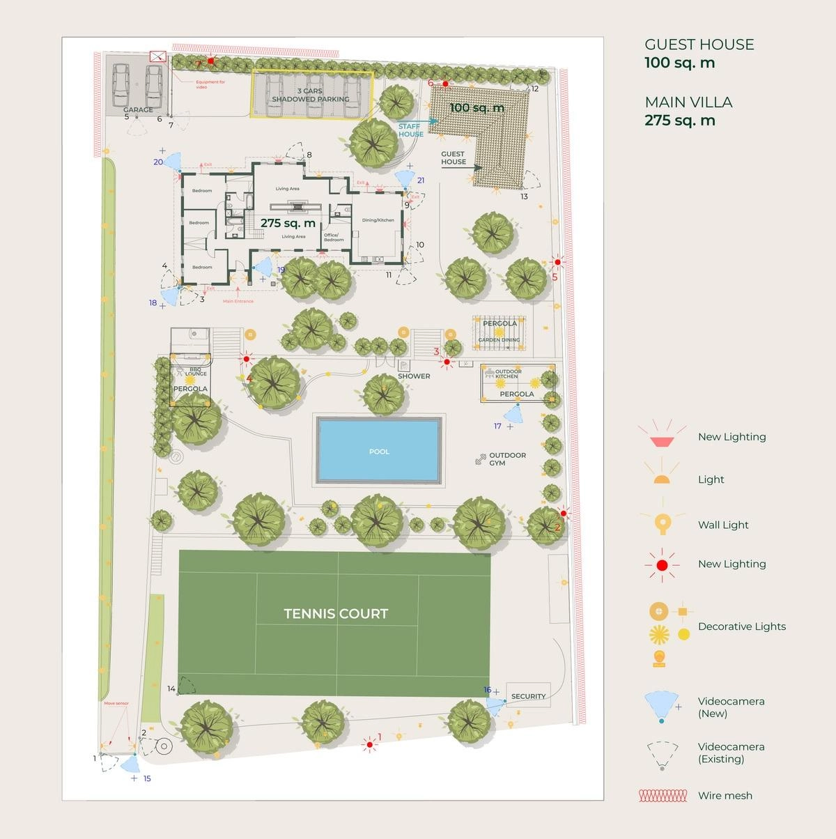 For sale an eight-bedroom villa of 275 m2 on a plot of 3000 m2 in the Souni area, Limassol city. The property includes 8 bedrooms (5 in the main house, 2 in studio-type guest houses and 1 used as an office), 7 bathrooms, a kitchen, a living room with a fireplace, 3 covered verandas, 2 storerooms, as well as a laundry room and a garage for 2 cars. Outdoor parking for 3 cars and a modular staff house are also provided on site. The villa is fully furnished, equipped with household appliances and engineering systems: inverter split air conditioning systems, central heating, solar panels, a heated swimming pool measuring 6×12 m and up to 3 m deep, video surveillance with 21 cameras, automatic irrigation and lighting system, as well as a pool aeration system. The residence includes a tennis court, a summer kitchen, a barbecue area and outdoor exercise equipment. The site has been improved: water supply and irrigation systems have been upgraded, gazebos have been built, landscaping has been updated, drains and a new roof have been installed.In 2022, the roof of the main house was completely renovated, all bathroom drainage systems were replaced, new inverter air conditioners were installed, windows and entrance doors in the guest house were updated, and all rooms were redecorated.