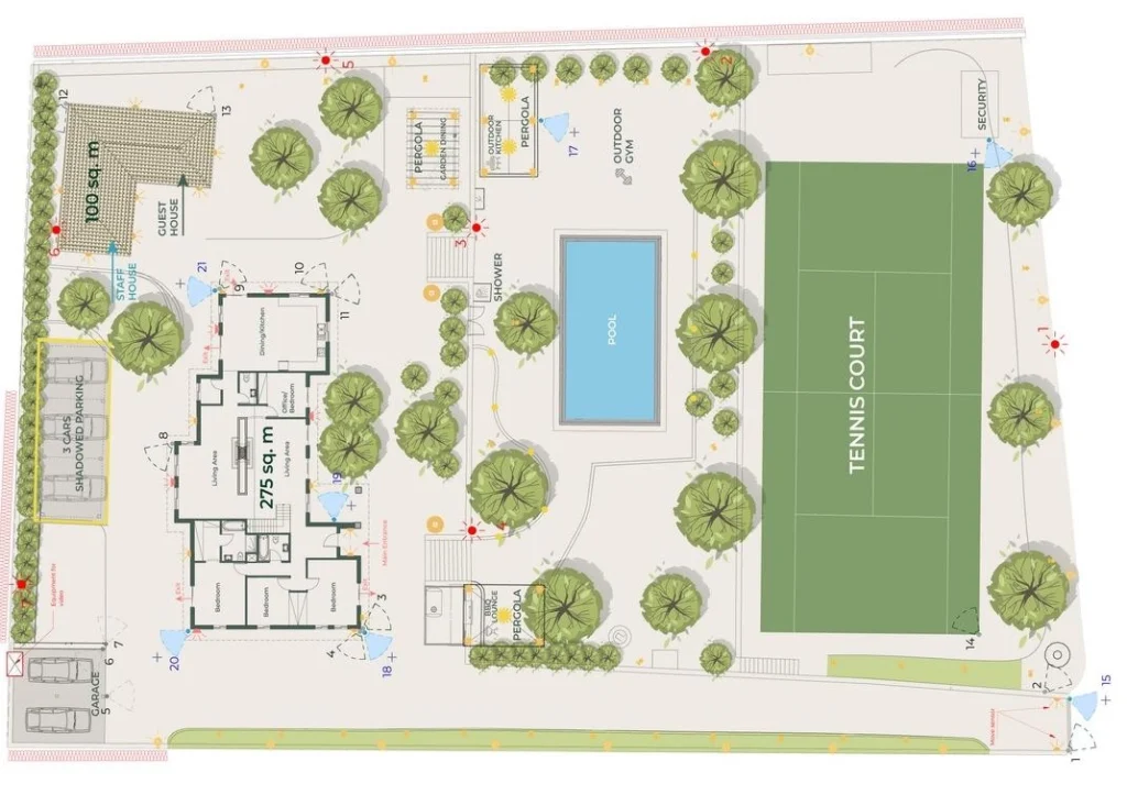 For sale an eight-bedroom villa of 275 m2 on a plot of 3000 m2 in the Souni area, Limassol city. The property includes 8 bedrooms (5 in the main house, 2 in studio-type guest houses and 1 used as an office), 7 bathrooms, a kitchen, a living room with a fireplace, 3 covered verandas, 2 storerooms, as well as a laundry room and a garage for 2 cars. Outdoor parking for 3 cars and a modular staff house are also provided on site. The villa is fully furnished, equipped with household appliances and engineering systems: inverter split air conditioning systems, central heating, solar panels, a heated swimming pool measuring 6×12 m and up to 3 m deep, video surveillance with 21 cameras, automatic irrigation and lighting system, as well as a pool aeration system. The residence includes a tennis court, a summer kitchen, a barbecue area and outdoor exercise equipment. The site has been improved: water supply and irrigation systems have been upgraded, gazebos have been built, landscaping has been updated, drains and a new roof have been installed.In 2022, the roof of the main house was completely renovated, all bathroom drainage systems were replaced, new inverter air conditioners were installed, windows and entrance doors in the guest house were updated, and all rooms were redecorated.